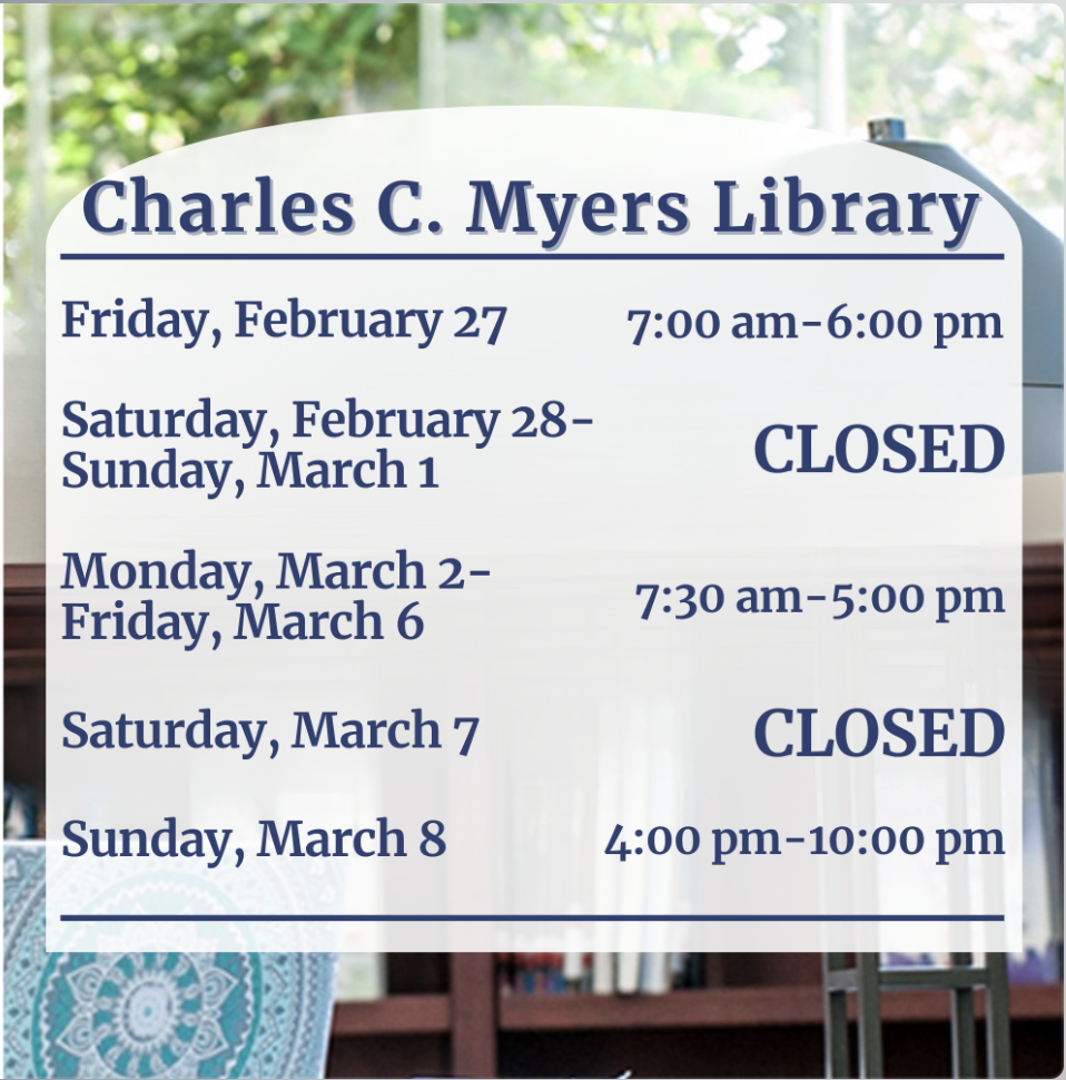 The Charles C. Myers Library staff connects students to resources they need to become educated, life-long learners. The Library is also a cultural center with a welcoming learning environment.
