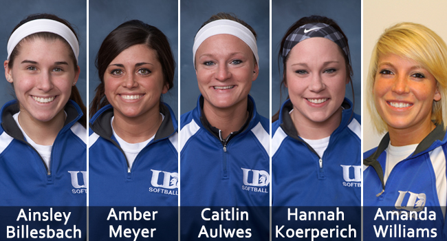 CEDAR RAPIDS, IOWA - The Iowa Intercollegiate Athletic Conference (IIAC) announced its All-Conference Teams and major awards for the 2014 softball season with five Spartans earning recognition. Senior Amber Meyer (Bernard, Iowa/Cascade) and sophomore Ainsley Billesbach (Belvidere, Ill./Belvidere North) were named First Team All-IIAC. A trio of Spartans earned Second Team All-IIAC with Caitlin Aulwes (Edgewood, Iowa/Edgewood-Colesburg), Hannah Koerperich (Dubuque, Iowa/Hempstead), and Amanda Williams (Taylor Ridge, Ill./Rockridge) making the cut. UD finished the season with a school record 22 wins and qualified for the IIAC Tournament for the second straight year.