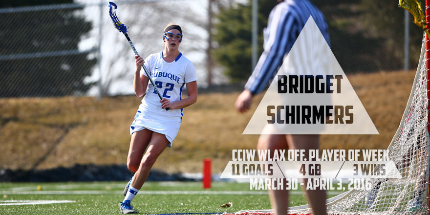 DUBUQUE, Iowa – Senior attacker and the University of Dubuque women’s lacrosse team’s all-time leading scorer, Bridget Schirmers, totaled 11 goals in trio of victories last week to earn the College Conference of Illinois and Wisconsin’s women’s lacrosse Offensive Player of the Week.